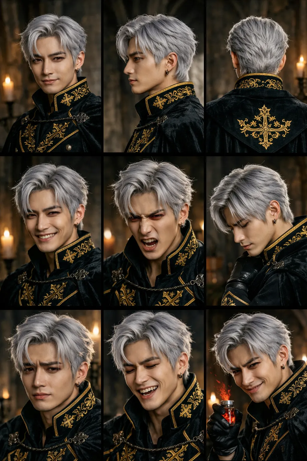 He wears a black gothic military-style coat with luxurious gold embroidery and black gloves.