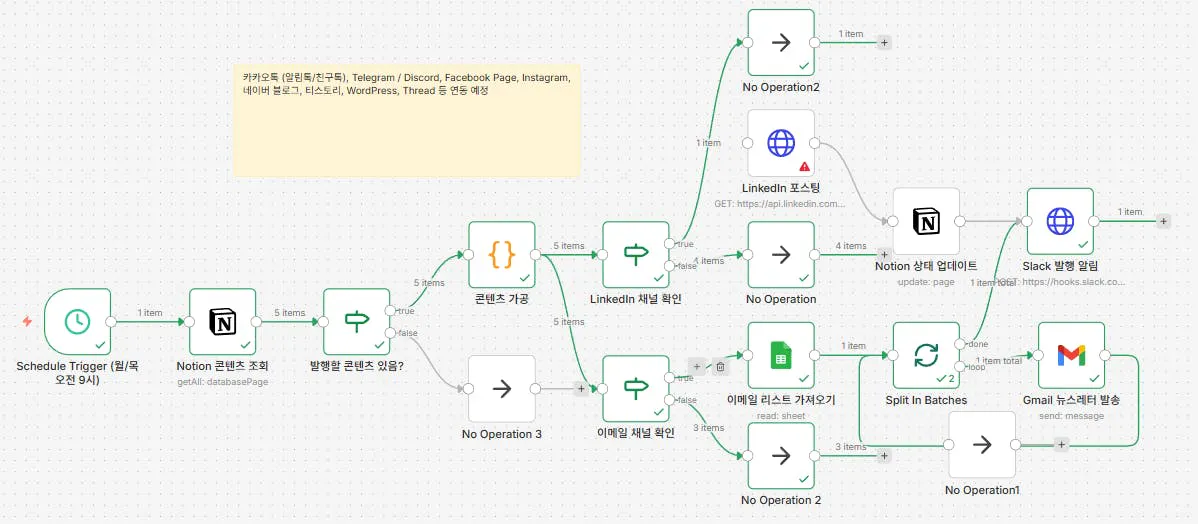 놀라운 점은 Claude가 생성한 n8n 워크플로우 JSON을 그대로 복사-붙여넣기만 해도 80% 이상 작동했다는 것입니다. 각 노드의 인증 정보만 재설정하고, 복잡한 코드 노드는 Gemini와 협업하며 완성해 나갔습니다. 2일 만에 실제로 돌아가는 MVP를 만들 수 있었습니다.