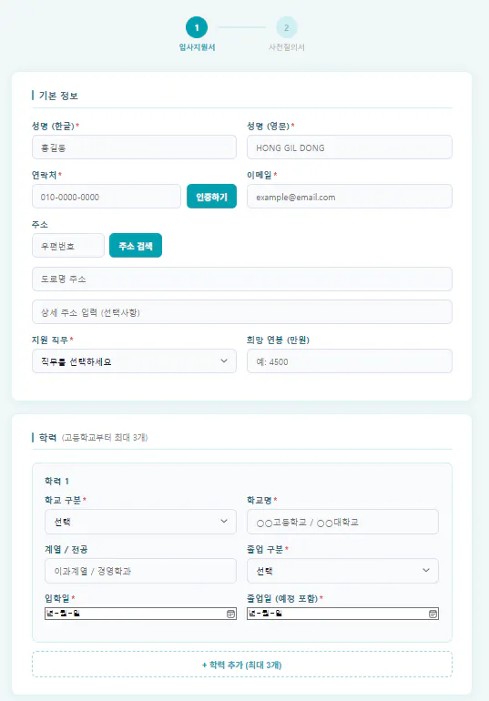 근데 일단 지금의 UI가 좋은 것 같아서 일단은 이 화면을 더 진행시켜 보자고 했고- 여기까지 하고 입사지원서 페이지를 수정했어요.