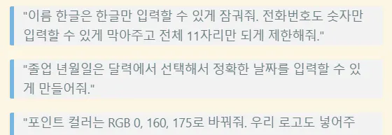 조금 놀라웠던건 휴대폰 인증, 도로명 주소 검색 후 반영 등의 툴까지도 알아서 척척 찾아서 반영하다는 거였고, 이 부분은 아직 상용화를 하게 될지 내부 결재가 안되서 일단 보류해뒀어요. 이것들까지 연결하면 좀 더 실무와 연결된 것들을 해볼 수 있을 것 같습니다.