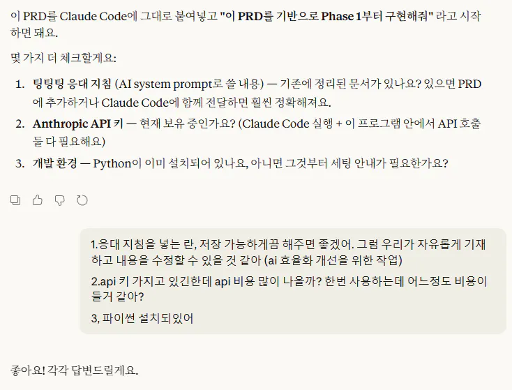 "이 플랜이 완벽하냐, 완성도를 높이려면 뭘 더 물어봐야 하냐" 식으로 계속 물어보니까 진짜 핵심적인 부분들을 잘 짚어주더라고요. 그렇게 오가면서 점점 내용이 구체화되고, 어느 정도 됐다 싶었을 때 Claude Code에 넘길 PRD로 정리해달라고 했습니다.