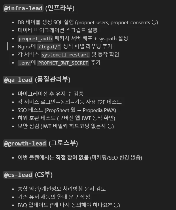 - 부서 간 의존성 관리 (예: DB 생성 → 라이브러리 → 서비스 통합 순서)