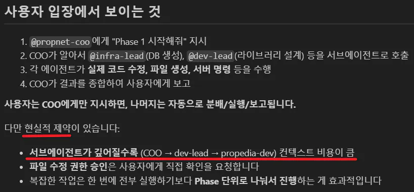 - 서브에이전트가 깊어질수록 (COO → dev-lead → propedia-dev) 컨텍스트 비용이 큼