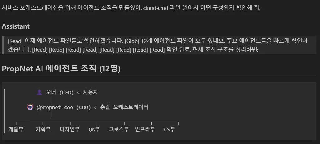 사용자 → @propnet-coo 호출 → Claude가 COO 역할로 응답