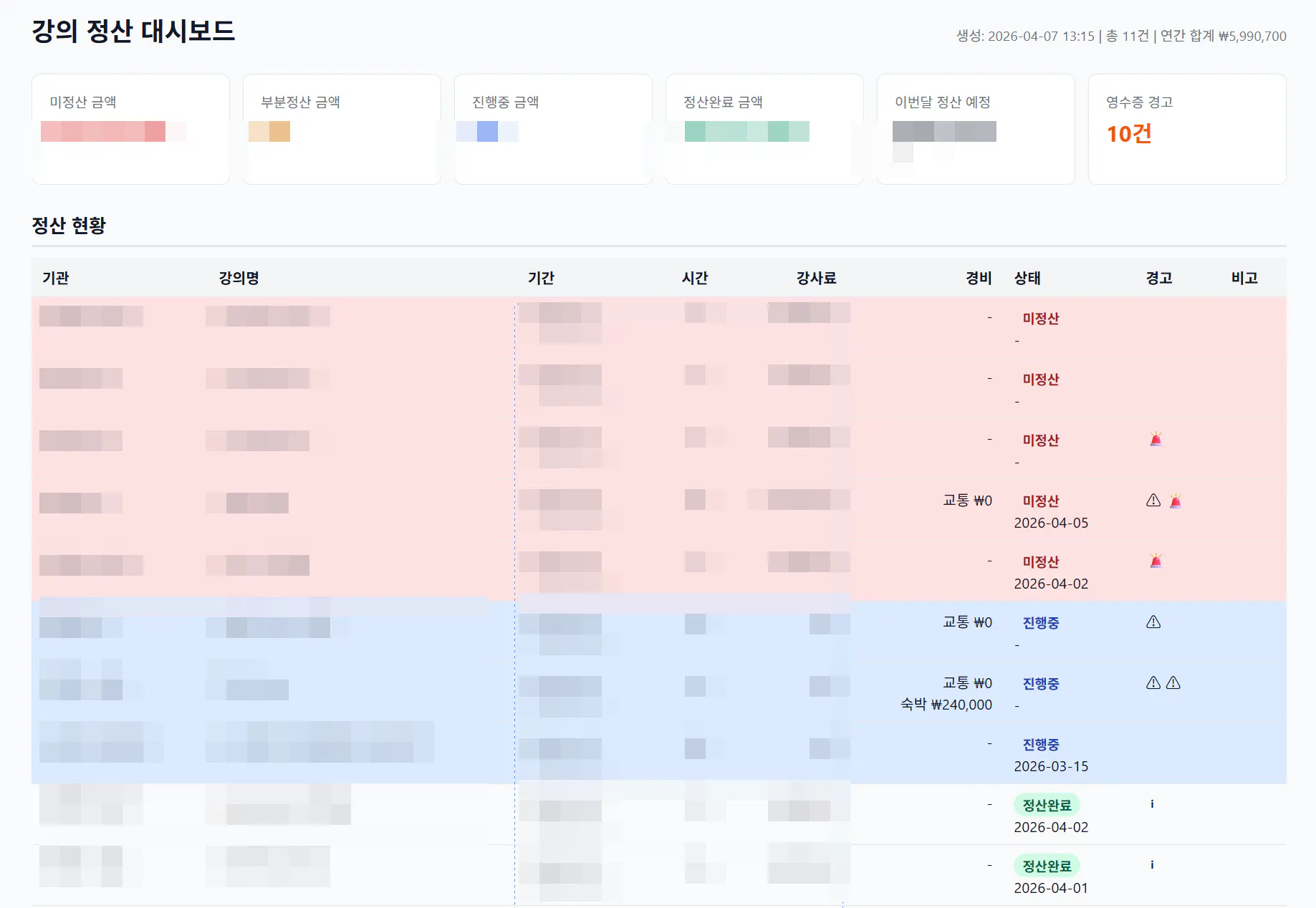 프리랜서 강사로 여러 기관에서 강의를 하다 보면, 정산 관리가 점점 복잡해집니다.- 어떤 기관은 입금이 됐고, 어떤 기관은 아직인지- 교통비/숙박비 영수증은 제출했는지- 이번 달 미정산 금액이 총 얼마인지엑셀에 정리