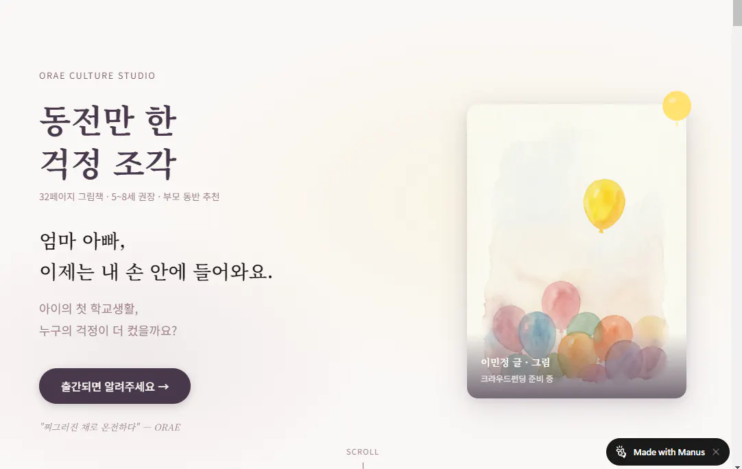 소개21기 Manus스킬과 스타트업실험실 과제를 이리저리 잘 버무려... Manus AI(이하 마누스)로 제가 쓰고 그린 그림책의 사전 독자 반응 테스트용 랜딩페이지를 만들어 보는 작업을 해 보았습니다. 진행 방법어