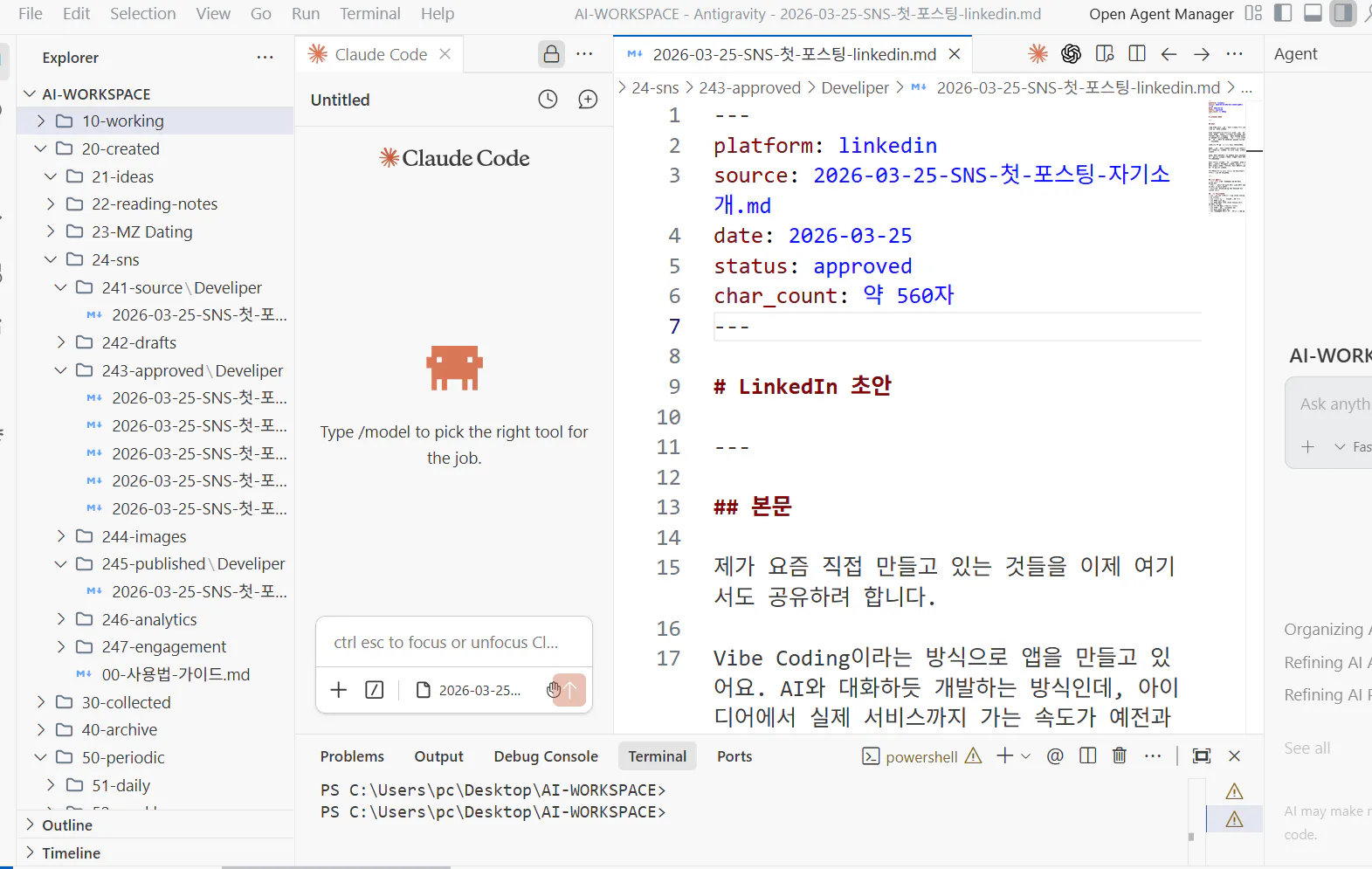 Claude code로 자동화한 SNS 컨텐츠 발행기에서 LinkedIn에 올릴 첫 게시글을 작성했습니다.작성은 했는데 영 체질이 SNS에 글 올리고 운영하는 스타일이 아니어서이제서야 꾹 참고 간신히(?) 올려봅니다