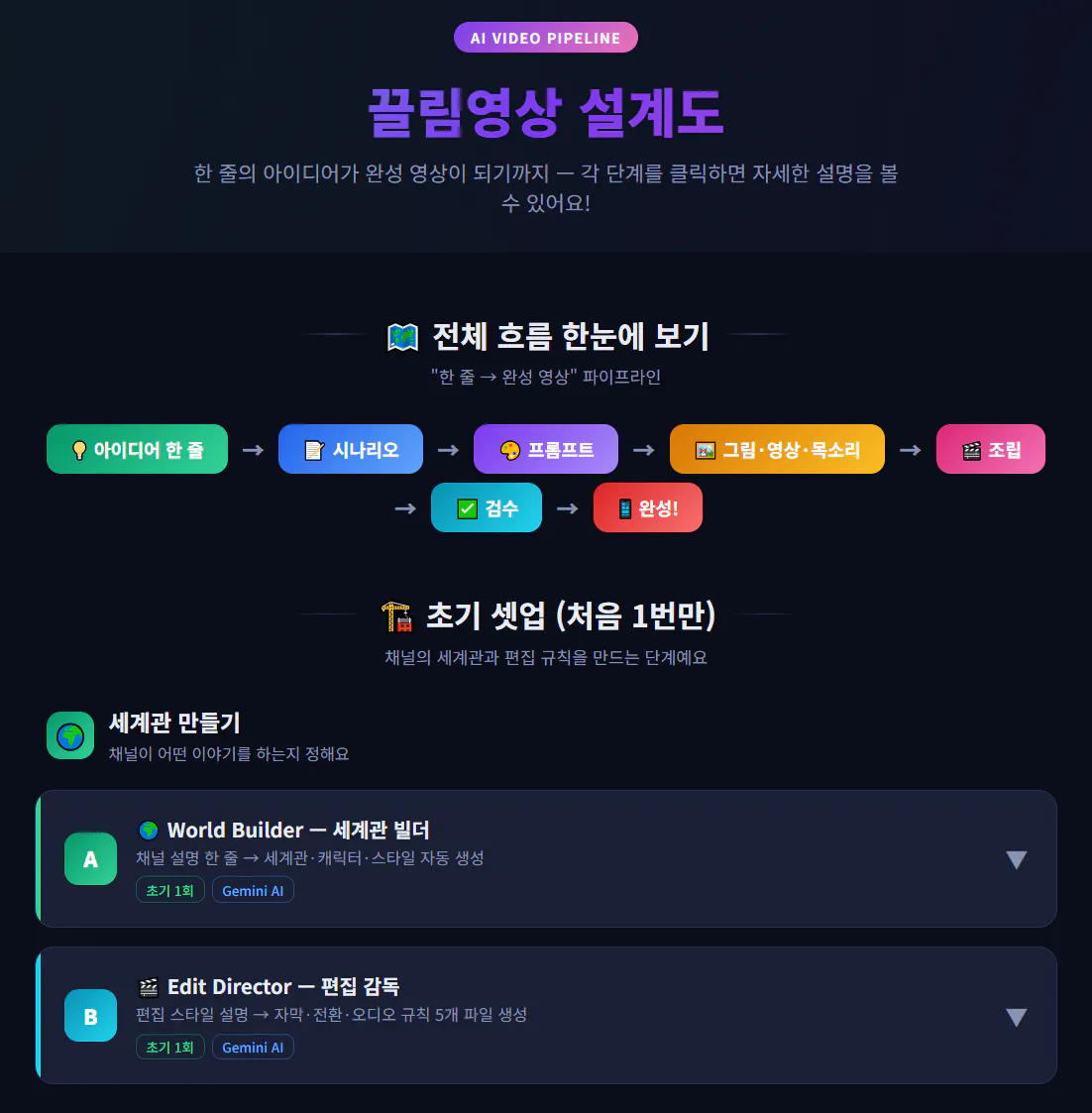 소개주제만 던지면 유튜브 숏폼 영상이 자동으로 업로드되는 파이프라인을 구축해보았습니다. Claude Code로 8개 에이전트 체계(스토리 작가 → 캐릭터 디자이너 → 씬 연출가 → 이미지 생성 → 오디오 생성 → 영