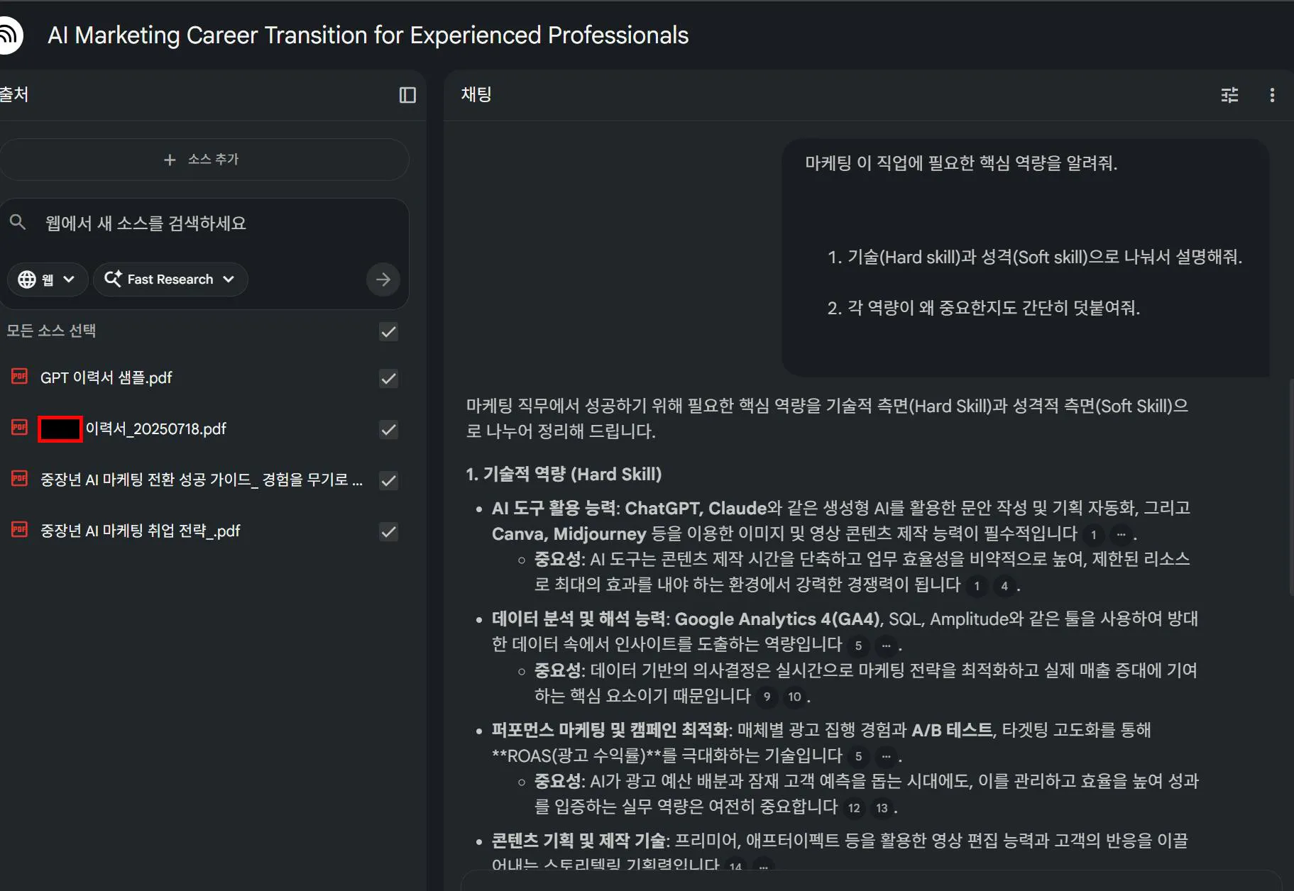 소개노트북 LM에 마케팅 커리어 관련 딥리서치 결과를 넣고다음과 같은 프롬프트를 통해 질문을 하였습니다.####핵심 역량 분석을 위한 프롬프트 입니다.이 직업에 필요한 핵심 역량을 알려줘.1. 기술(Hard skil