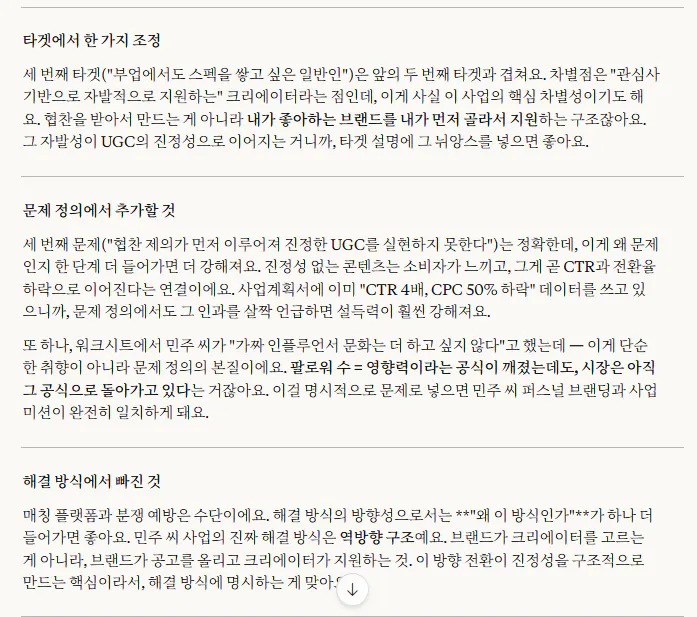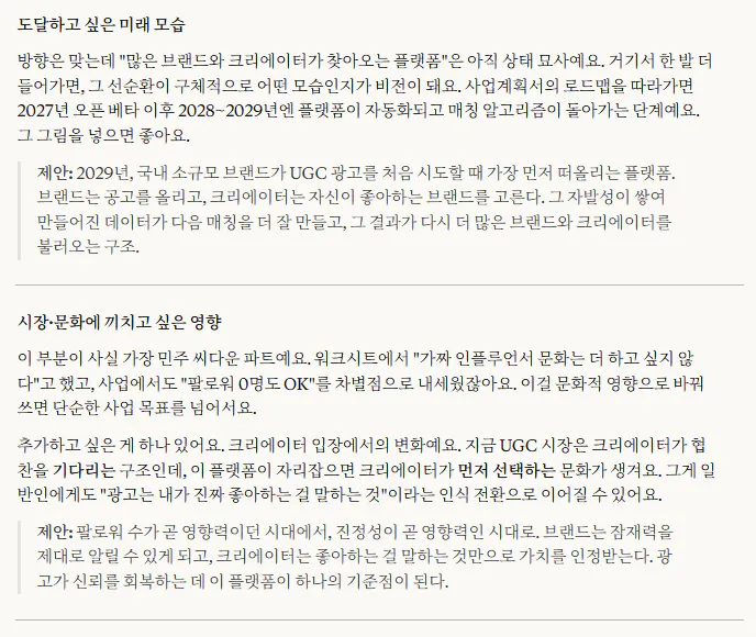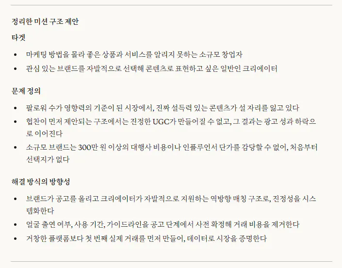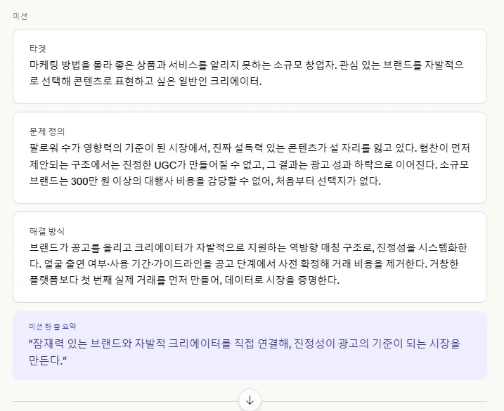 현재의 저는 창업 아이디어를 설명하는 데 집중하고 있었습니다. 시장 규모, 수익 모델, 경쟁사 분석. 근데 이번 작업을 하면서 느낀 건, 그것보다 먼저 해야 할 질문이 있었다는 겁니다. 나는 왜 이걸 하는 사람인가.