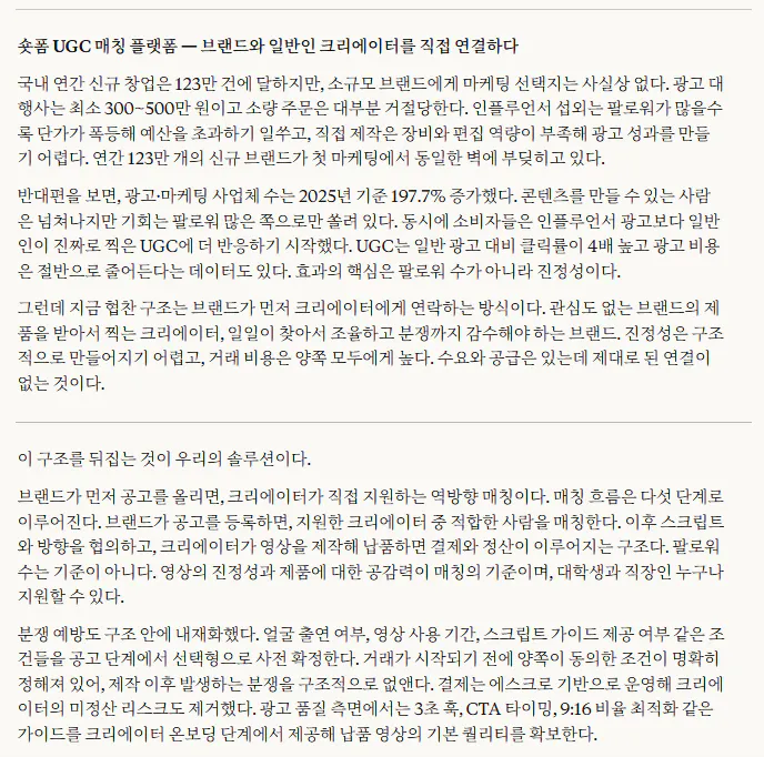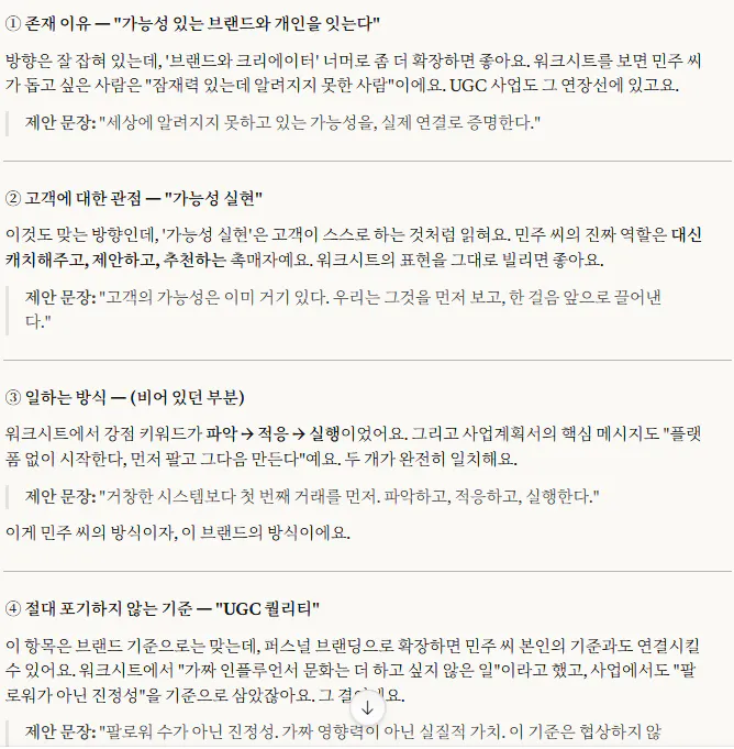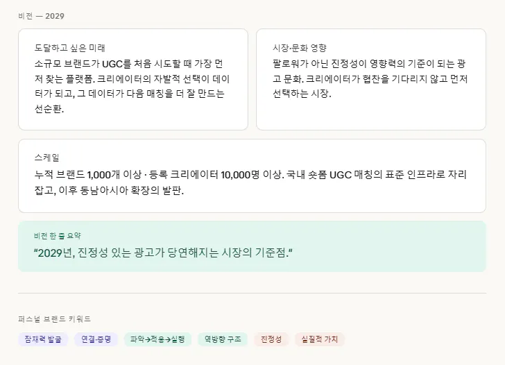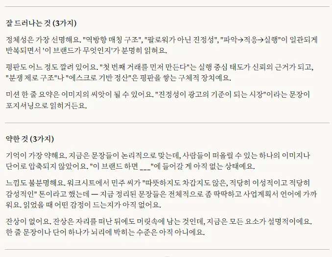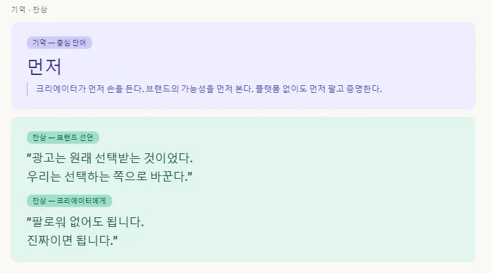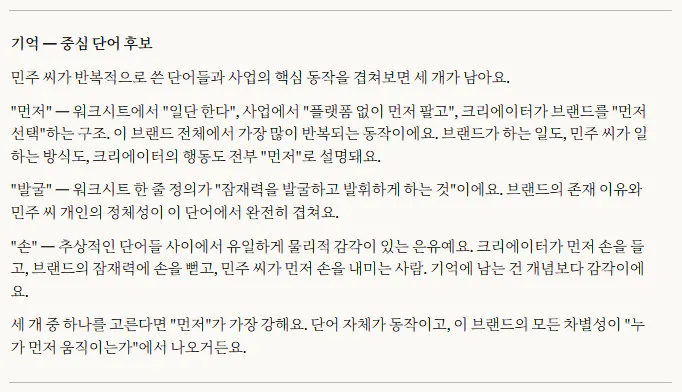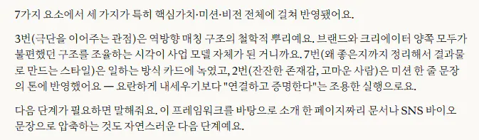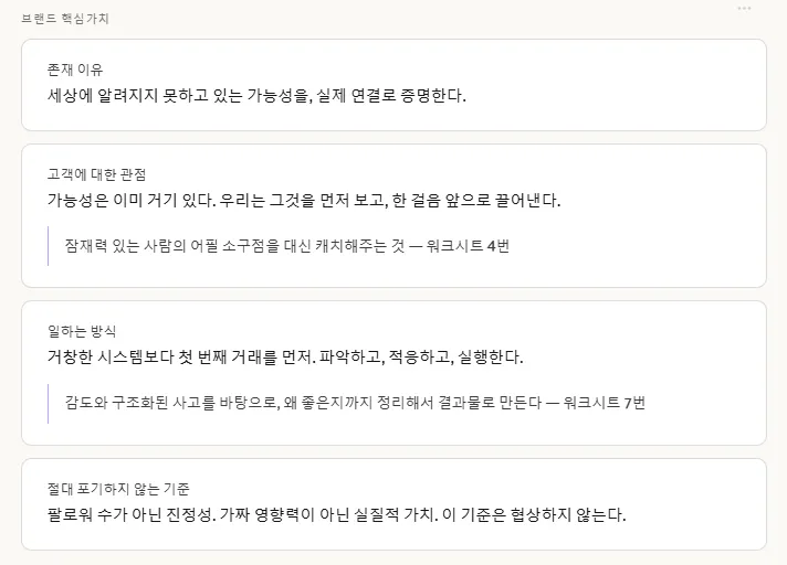 그게 작은 사업의 본질인 것 같다고 느꼈습니다. 초기 창업자한테 브랜드는 별도로 기획하는 게 아니라, 내가 어떤 사람인지가 그대로 브랜드가 되는 것. 이 작업은 브랜드를 만든 게 아니라, 원래 있던 나를 언어로 꺼낸 것에 가까웠습니다.