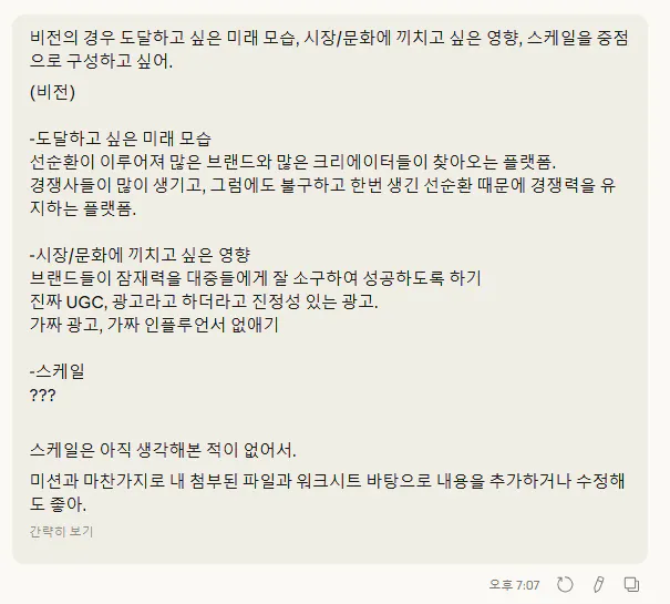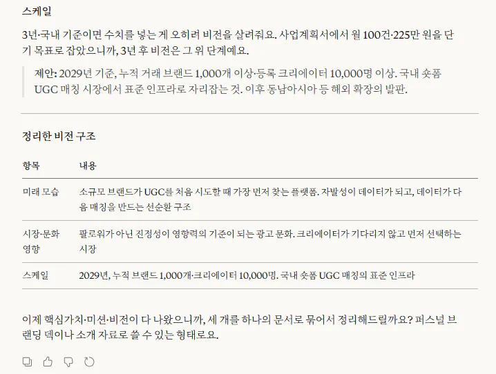 그래서 클로드에 사업계획서와 1주차에 했던 워크시트를 첨부하여 핵심 요소들을 포함한 브랜드 핵심 가치를 정리하도록 했어요