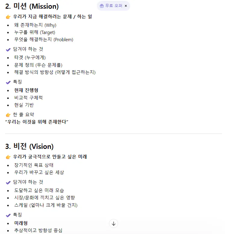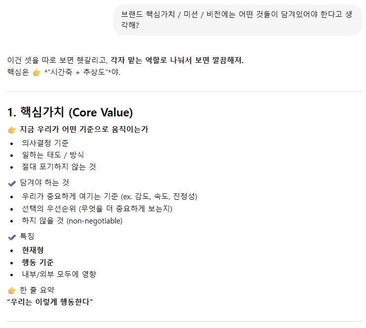 챗지피티에게 우선 브랜드 핵심 가치, 미션, 비전을 논할 때는 어떤 요소들이 들어가야 하는지부터 질문