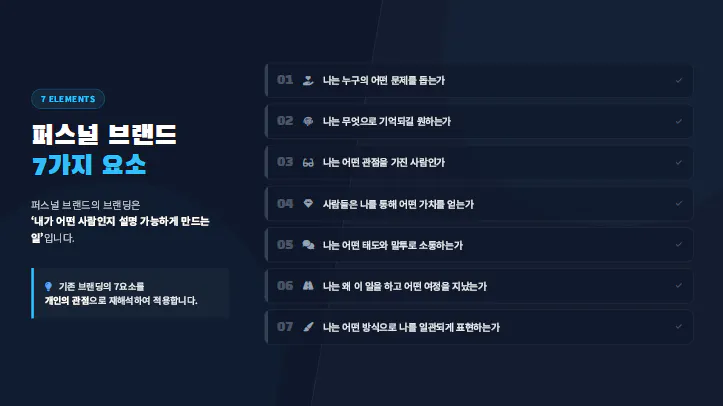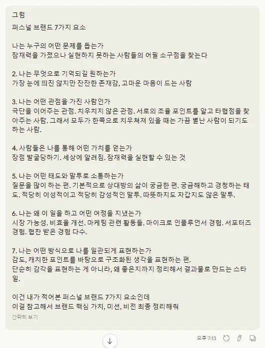 다음으로 J님이 알려주신 퍼스널 브랜드 7요소에 대해 직접 적어보고 이걸 바탕으로 가치, 미션, 비전을 최종 정리하였습니다