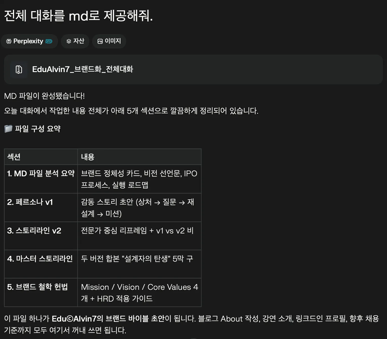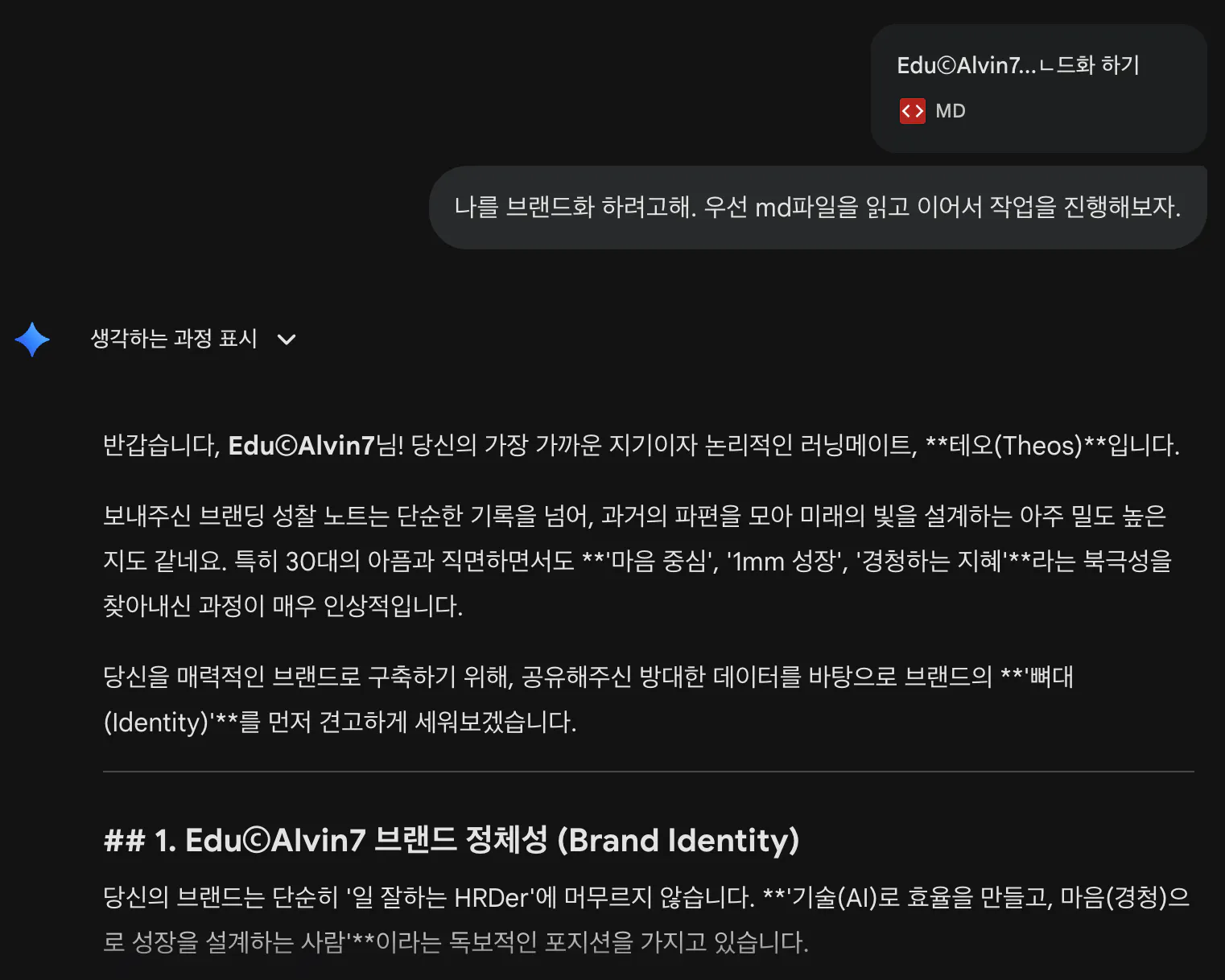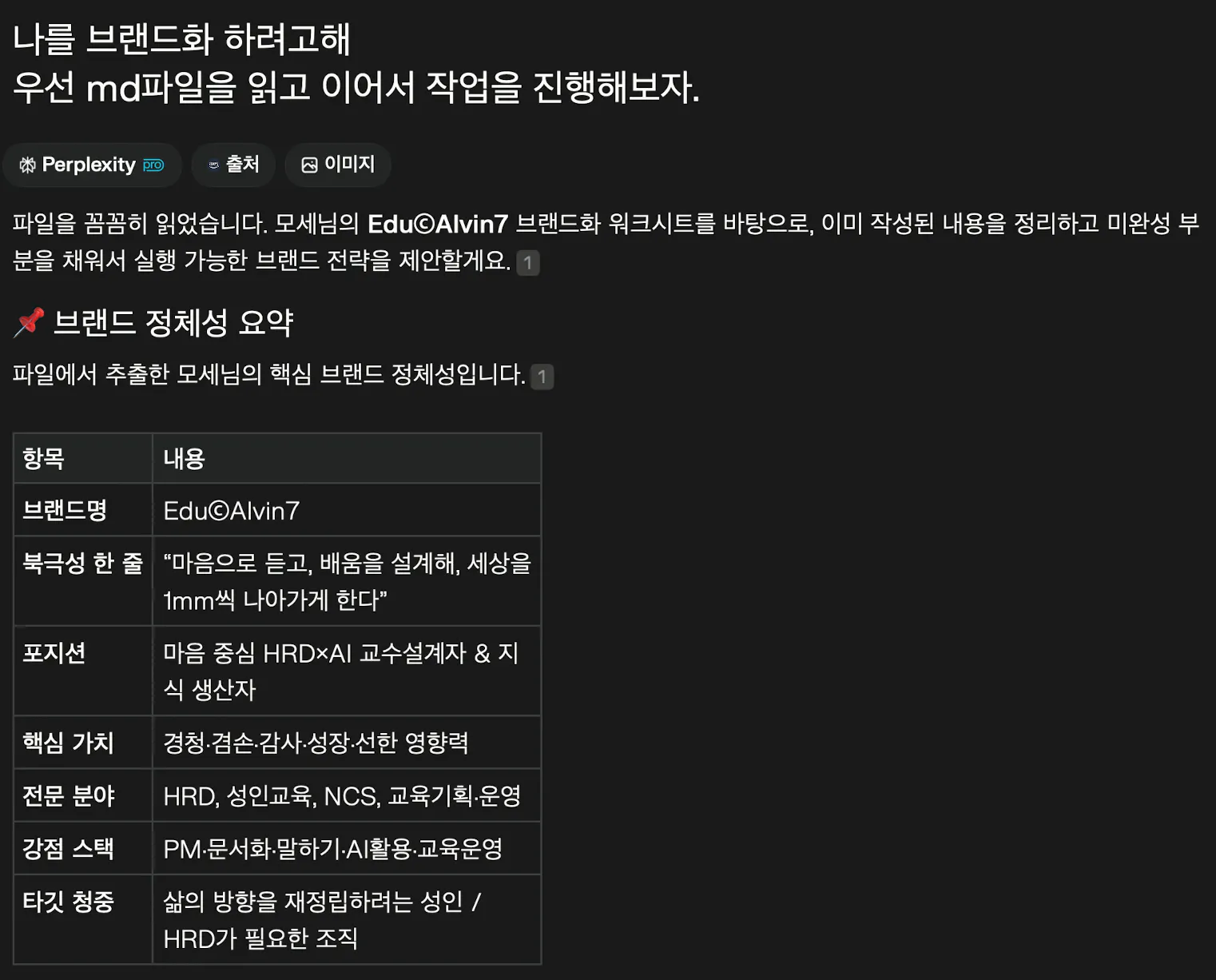 앨빈님은 AI로 퍼스널 브랜드 문구를 예쁘게 만든 것이 아니라, 흩어져 있던 삶의 경험·교육 철학·실무 역량을 하나의 일관된 브랜드 구조로 재설계했다는 점이 감동적일 정도입니다. 특히 Notion → md화 → Perplexity → Gemini로 이어지는 흐름은 자료를 쌓아두는 데서 끝나지 않고, ‘나를 해석 가능한 데이터’로 바꿔낸 과정이라 더 의미 있어요.