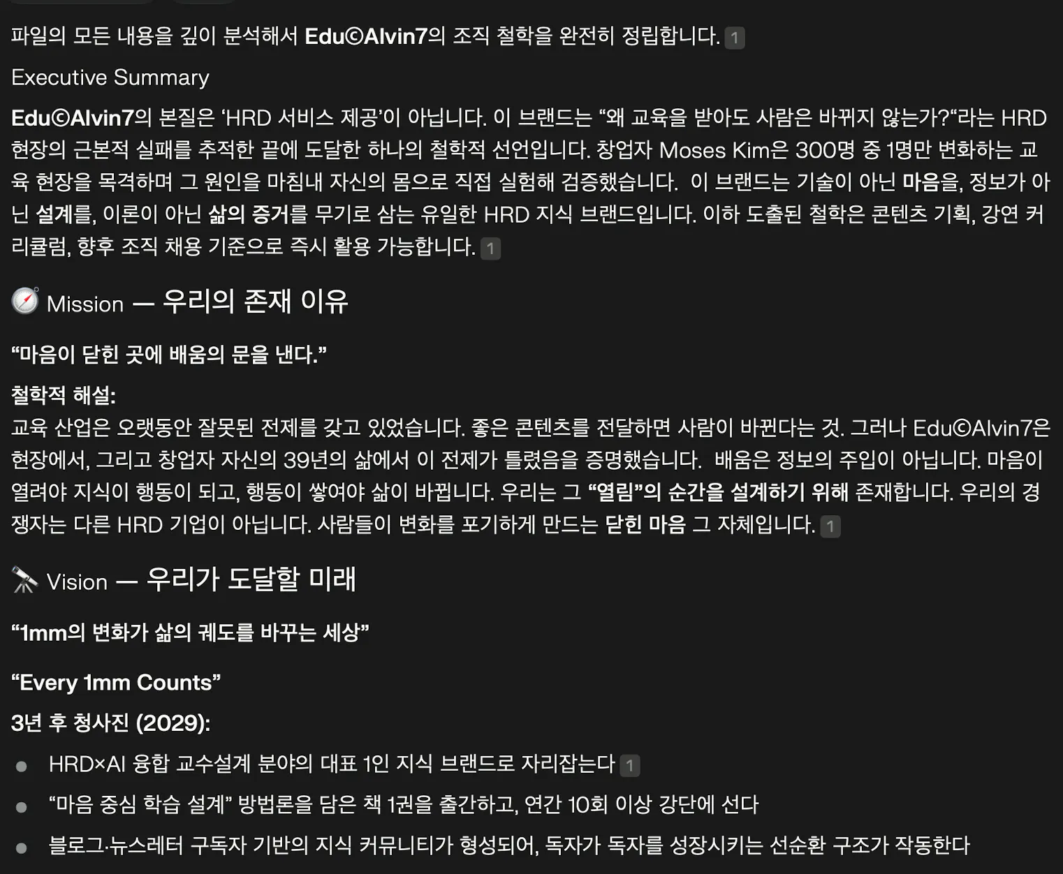 무엇보다 39년의 (아직 애기시네요?)정서적 방황과 질병, 그리고 HRD 20년의 실무를 ‘마음 중심 학습 설계자’라는 정체성으로 연결한 점이 정말 강합니다. 상처를 서사로만 소비하지 않고, 교육의 실효성을 높이는 설계 원리로 전환한 게 깊게 와닿았어요. 😊 이런 브랜딩은 포장이 아니라 증명이라는 생각이 들었습니다. 앞으로 EduⓒAlvin7님의 1mm 철학이 더 많은 사람의 행동 변화를 만들어낼 것 같아서 넘넘 기대됩니다용 🙌