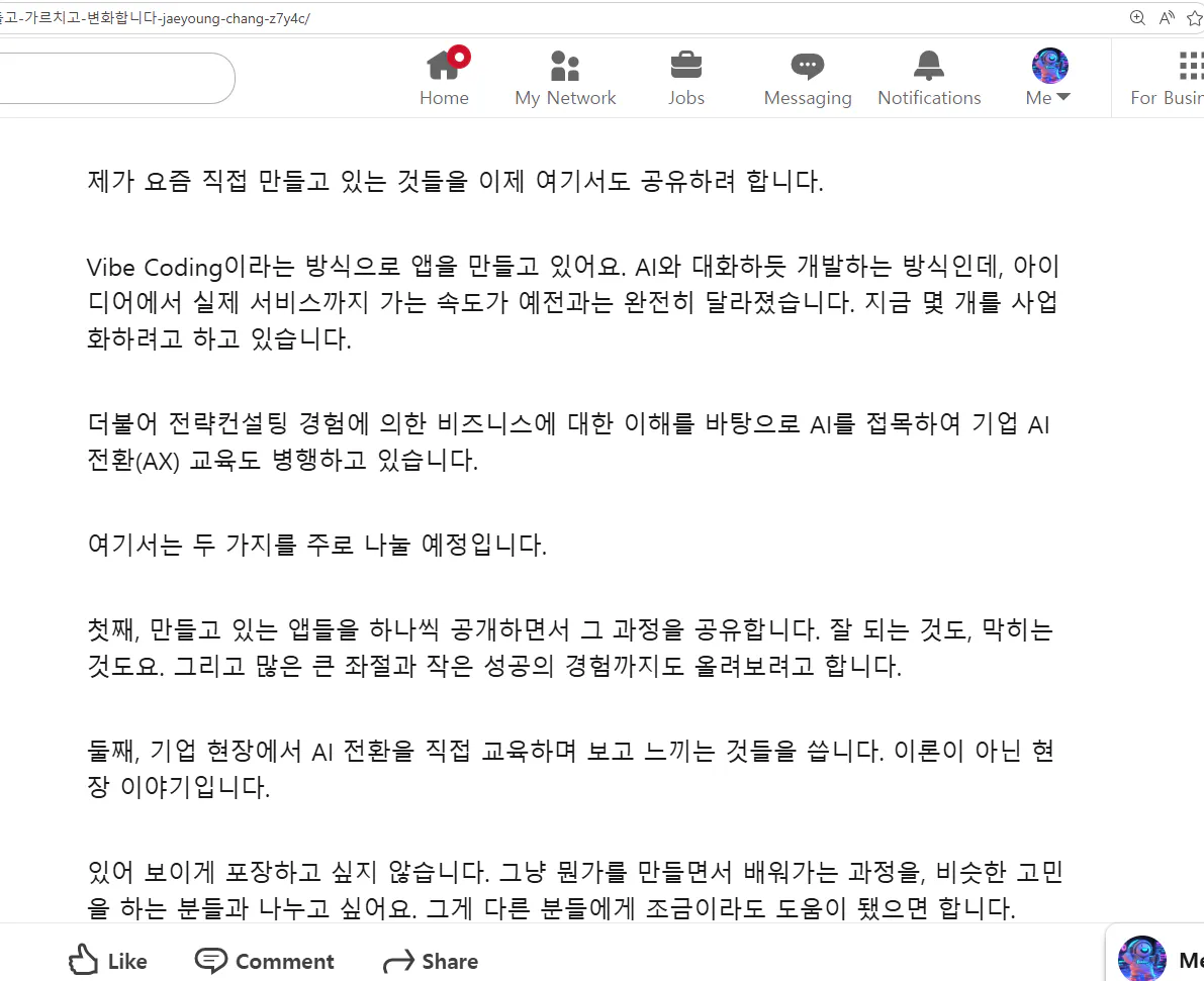 Claude code로 자동화한 SNS 컨텐츠 발행기에서 LinkedIn에 올릴 첫 게시글을 작성했습니다.