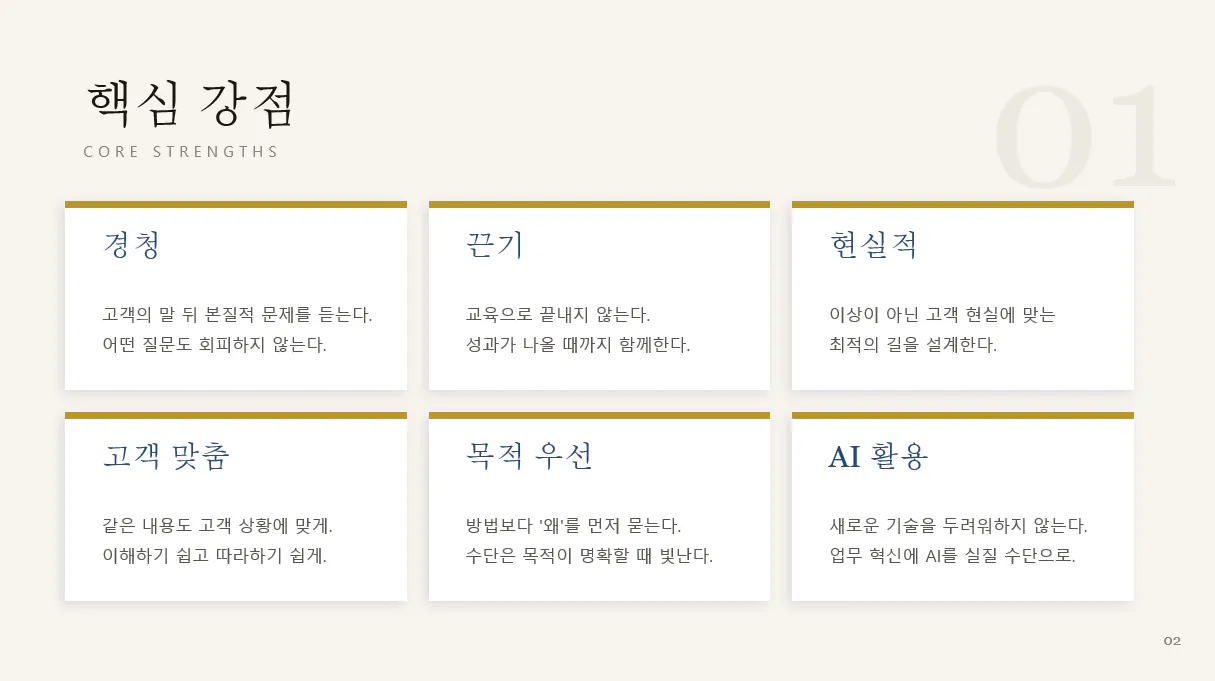 브랜딩 워크시트 작성 시 설명 입력이 부족하여 다소 미흡했던 강점을 보완하여 슬라이드 생성함