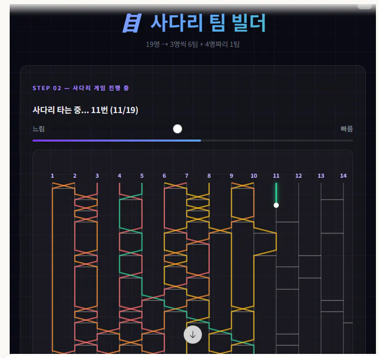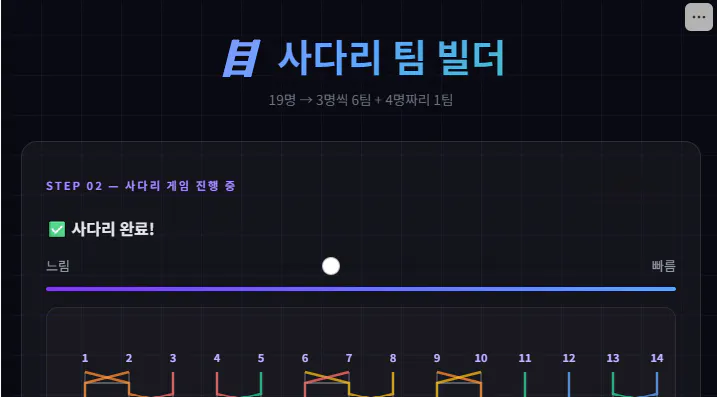 19명의 팀원들이 있는데 사다리 게임을 통해서 3명씩 팀을 짜려고 해